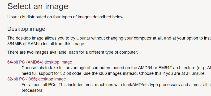 Select an image Ubuntu is distributed on four types of images described below. Desktop image The desktop image allows you to try Ubuntu without changing your computer at all, and at your option to install it permanently later. This type of image is what mo